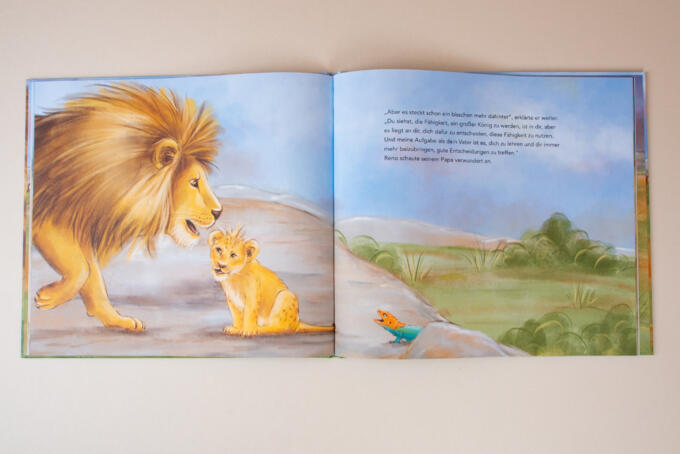 Der kleine Löwe Reno und sein Papa sitzen auf dem Felsen und schauen der untergehenden Sonne zu. Es ist Zeit für den kleinen Löwen, schlafen zu gehen. Reno ist aber noch überhaupt nicht müde, denn ihn beschäftigt eine sehr wichtige Frage: „Warum bin ich eigentlich auf der Welt?“
